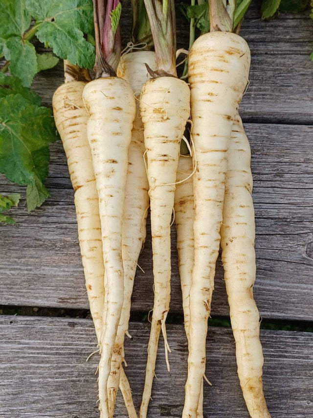 Description: An absolute must-have for any garden, this exceptional variety continually impresses with its consistent production of perfectly shaped, refined roots that span 12-14 inches in good soil. Perfect for grating or using in various dishes like egg rolls, strudels, and savory pies, Try roasted parsnips topped with pesto for a next level culinary experience. it's a versatile addition to any kitchen.